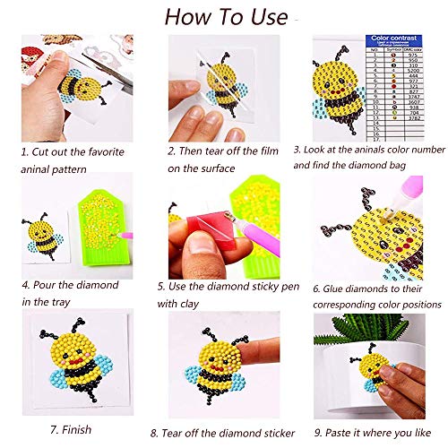 Eenvoudig te gebruiken: het uitsnijden van een dierendiamantsticker, scheur de transparante hoes af, gebruik de dierkleurnummertabel om de kleur te vinden die overeenkomt met het stickernummer en plak de strass op de sticker met een strass pen.