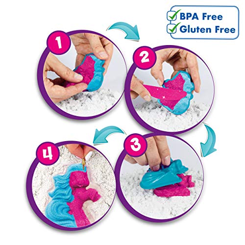Ziet eruit als zand, voelt aan als zand, druppelt door de handen als zand – maar kan worden gevormd als kneed. Magic Sand Unicorn Set bevat elk 200 g zand in 3 kleuren, vormpjes, vleugels en gouden hoorns, modelleerspatel en een speelbak. De Magic Sand Unicorn set is creatief speelplezier voor alle fans van Unicorn. Met het glitterzand kunnen eenhoorns, staarten en vleugels worden gemodelleerd. Magic zand blijft in vorm en droogt niet uit, is antibacterieel, ruikt niet, plakt niet aan de handen en kan eenvoudig van kleding en voorwerpen worden verwijderd.