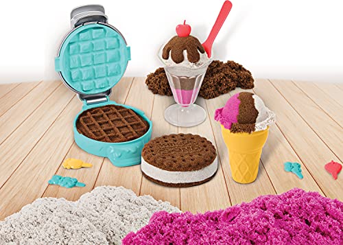 Maak ijscreaties. meng, vorm en maak je eigen sundae-ijsjes, wafels, ijskoekjes en ijshoorntjes. Kinetic Sand droogt nooit uit, dus je kunt steeds weer iets nieuws maken