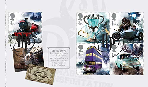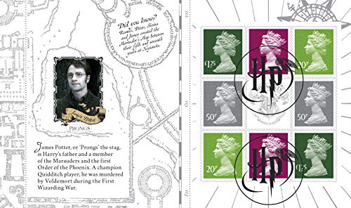 Royal Mail presenteert Harry Potter speciale merken met een aantal van de populairste karakters zoals Harry, Hermione, Ron, Ginny en Neville Longbottom. Ook inbegrepen zijn geselecteerde portkeys en de meest iconische verkeersdragers, waaronder de Hogwarts Express, die van Hagrid, de ridderbus en de Triwizard Cup. Het Prestige-stempelboek bevat 24 pagina’s vol afbeeldingen met sleutelfiguren en scènes uit de Harry Potter-films. Bevat korte biografieën van de belangrijkste figuren zoals Moony, Wormtail, padfoot en Prongs – de makers van de Marauder Map – en Luna Lovegood en Fred en George Weasley onder andere . Binnen het boek bevat het vijf schijven, waaronder alle 15 speciale stempels en een schijf met een Harry Potter logo poststempel in het midden.