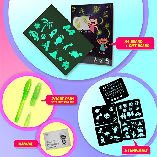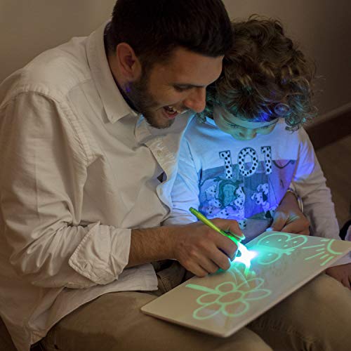 ???? NEON LICHTGEVENDE MAGISCHE TEKENINGEN: Schenk jouw kinderen fun en plezier met ons innovatieve magisch tekenbord voor jongens en meisjes 3 to 12 jaar oud. Met het magische tekenbord kunnen kinderen levendige, lichtgevende tekeningen maken en fantasiewerelden creëren met echt licht. Bevat: tekenborden, 2 LED-pennen, stencils en onzichtbare inkt om de creativiteit te vergroten.